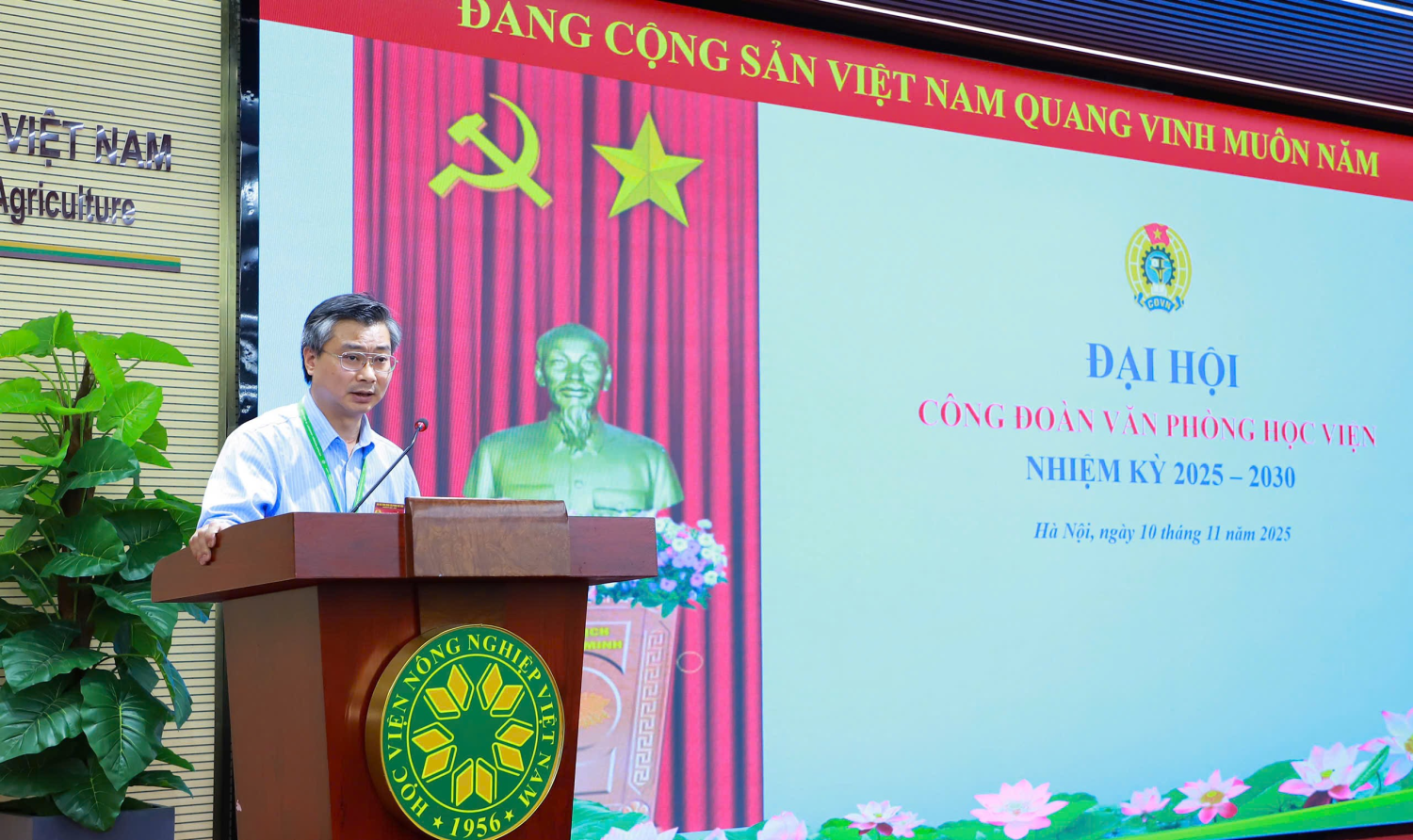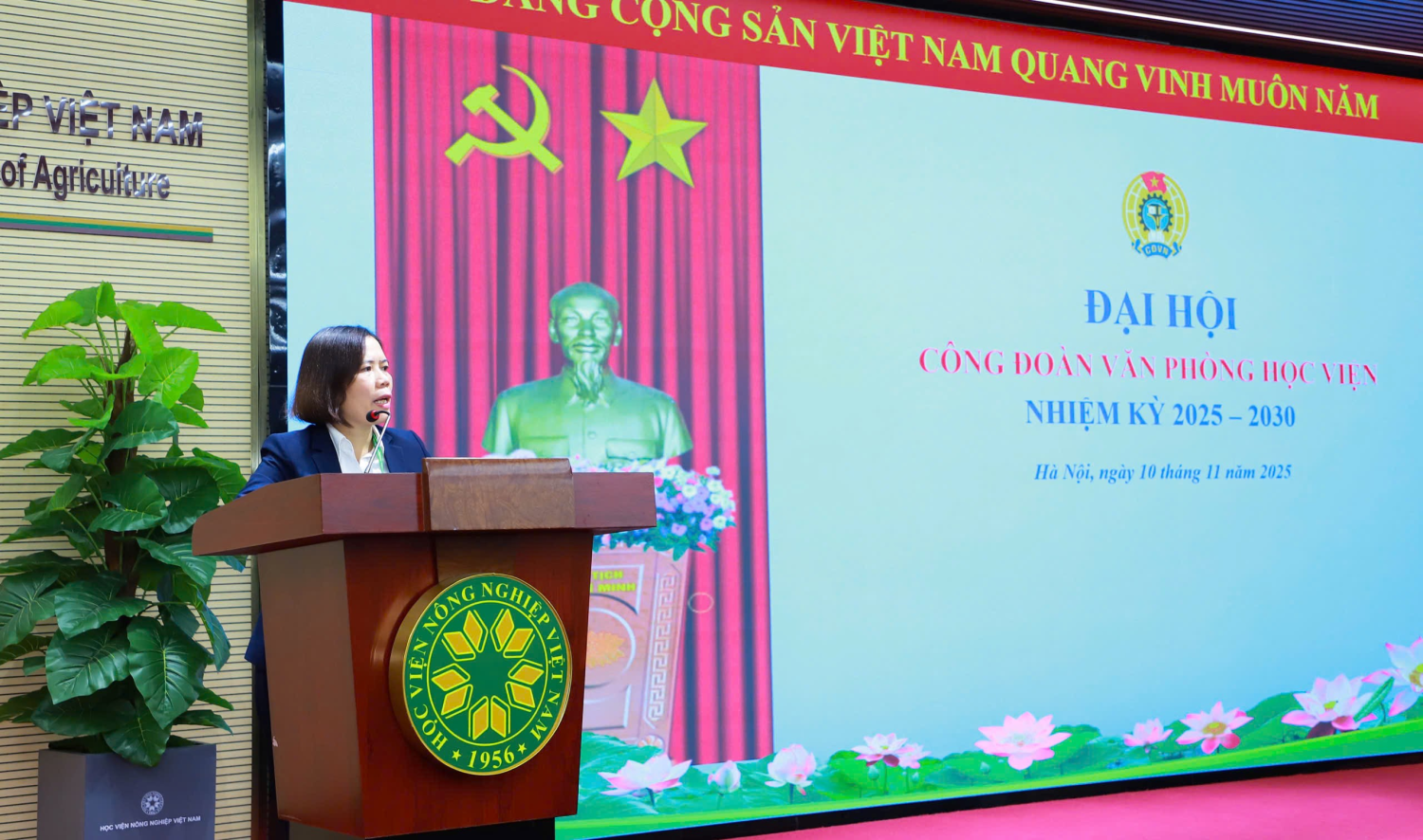 Sáng ngày 10/11/2025, Công đoàn Văn phòng Học viện đã tổ chức Đại hội Công đoàn nhiệm kỳ 2025 – 2030. Đến dự và chỉ đạo Đại hội có đồng chí Nguyễn Công Tiệp – Ủy viên Ban Thường vụ Đảng uỷ, Phó Giám đốc Học viện; đồng chí Đỗ Thị Hường – Phó Chủ tịch Công đoàn Học viện; đồng chí Dương Thành Huân – Bí thư Chi bộ, Chánh Văn phòng Học viện và 54 đoàn viên công đoàn được triệu tập về tham dự. Toàn cảnh Đại hội Công đoàn Văn phòng Học viện nhiệm kỳ 2025 -2030 Đại hội Công đoàn nhiệm kỳ 2025 – 2030 nhằm tổng kết công tác công đoàn giai đoạn 2023 – 2025 (nhiệm kỳ 2023 – 2028) và đề ra phương hướng, nhiệm vụ trong nhiệm kỳ mới. Dưới sự lãnh đạo sát sao của Công đoàn Học viện, sự phối hợp chặt chẽ giữa Chi uỷ, Chính quyền và Công đoàn, Công đoàn Văn phòng Học viện đã hoàn thành xuất sắc các nhiệm vụ chính trị được giao và đạt được nhiều kết quả nổi bật như: Giải Nhất hội thi gói nấu bánh chưng Xuân Quý Mão 2023; giải Nhất toàn đoàn Hội thao CBVC năm 2024; giải Đặc biệt Hội thi “Sắc màu phái mạnh” nhân dịp 08/3/2025 và nhiều giải thưởng tập thể, cá nhân khác… Công đoàn Văn phòng Học viện cũng tích cực tham gia các hoạt động nhân văn, thiện nguyện như: quỹ Đền ơn đáp nghĩa, ủng hộ đồng bào vùng lũ, ủng hộ nhân dân Cuba. Những kết quả đó có được là nhờ sự phối hợp hiệu quả giữa cấp uỷ, chính quyền, công đoàn và sự tham gia trách nhiệm, nhiệt huyết của mỗi đoàn viên công đoàn. Đại hội đã thảo luận và đóng góp ý kiến đối với Dự thảo Báo cáo tổng kết hoạt động Công đoàn Văn phòng giai đoạn 2023 – 2025 (nhiệm kỳ 2023 – 2028) và phương hướng hoạt động nhiệm kỳ 2025 – 2030; đồng thời góp ý Dự thảo Báo cáo của Công đoàn Học viện khóa XXXIII trình Hội nghị Đại biểu Công đoàn Học viện lần thứ XXXIV nhiệm kỳ 2025 – 2030. Phát biểu chỉ đạo tại Đại hội, đồng chí Nguyễn Công Tiệp – Ủy viên Ban Thường vụ Đảng uỷ, Phó Giám đốc Học viện ghi nhận và biểu dương những thành tích, nỗ lực của Công đoàn Văn phòng trong thời gian qua – là đơn vị có số lượng đoàn viên đông, khối lượng công việc lớn nhưng luôn hoàn thành nhiệm vụ với chất lượng cao, không để xảy ra sai sót trong thực thi công vụ. PGĐ Nguyễn Công Tiệp phát biểu chỉ đạo tại Đại hội Cũng tại Đại hội, đồng chí Đỗ Thị Hường – Phó Chủ tịch Công đoàn Học viện đã phát biểu chỉ đạo và đánh giá cao những kết quả tích cực của Công đoàn Văn phòng, đặc biệt là tinh thần đoàn kết, trách nhiệm và sự nhiệt tình, chủ động của đoàn viên dưới sự lãnh đạo sát sao của cấp uỷ, lãnh đạo đơn vị. Đồng chí Đỗ Thị Hường – PCT Công đoàn Học viện phát biểu chỉ đạo tại Đại hội